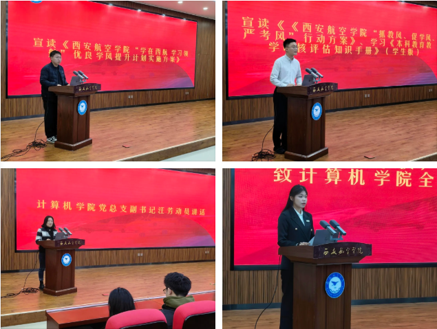 会上,李晨阳老师宣读《西安航空学院“学在西航 学习领航”优良学风提升计划实施方案》。侯勇老师宣读《西安航空学院“抓教风、促学风、严考风”行动方案》,并向全体学生讲解学生评估手册,鼓励大家积极学习手册内容。物联网233班周香雪同学向全体学生发出“爱校荣校,我为审评估贡献力量,营造良好学风建设”的倡议。
