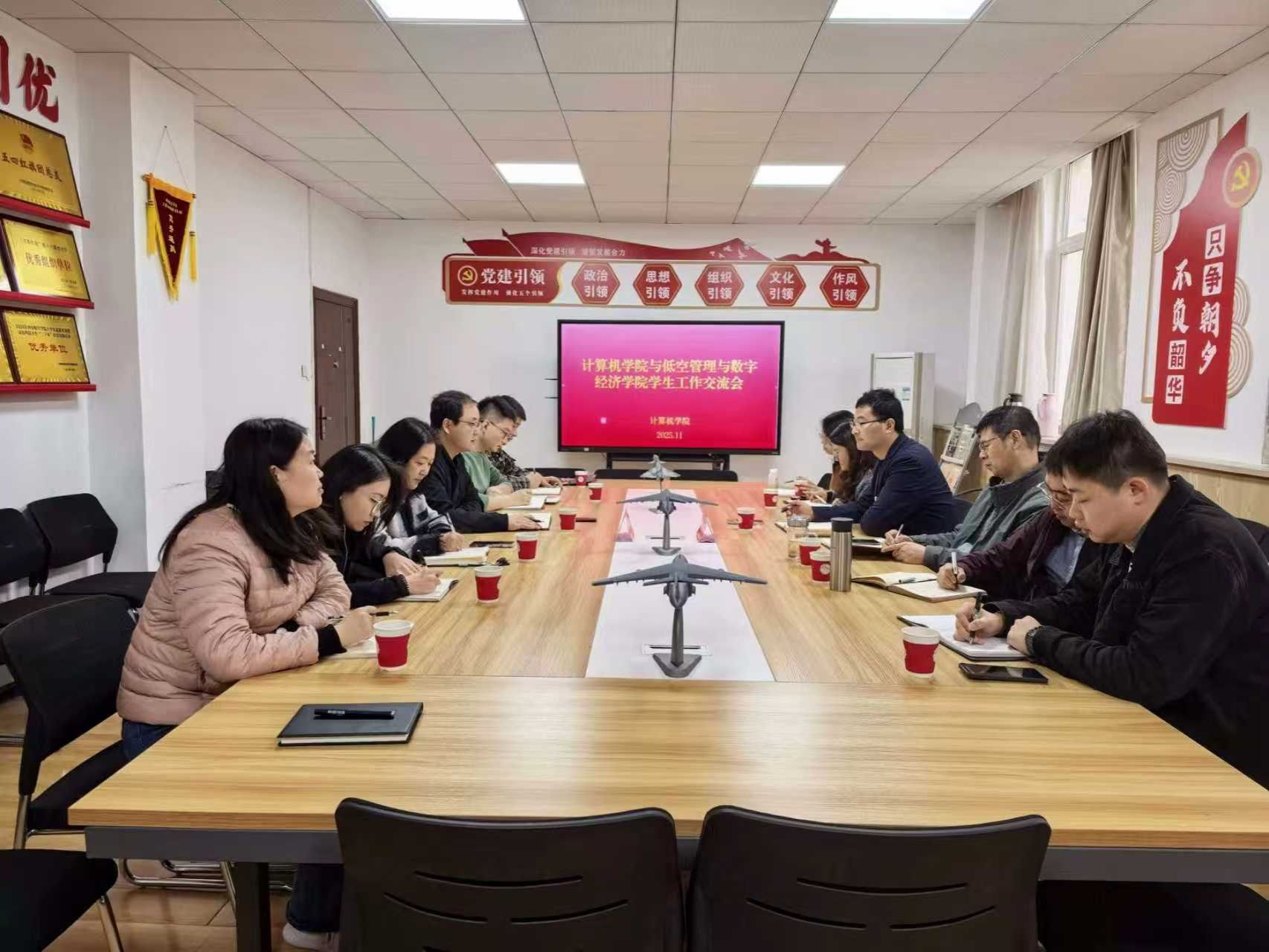 11月6日上午,计算机学院和低空管理与数字经济学院开展学生工作交流会。计算机学院党总支书记陈长征、副书记汪芳、低空管理与数字经济学院党总支书记张鹏、副书记班奕,两学院全体辅导员参加本次交流会。