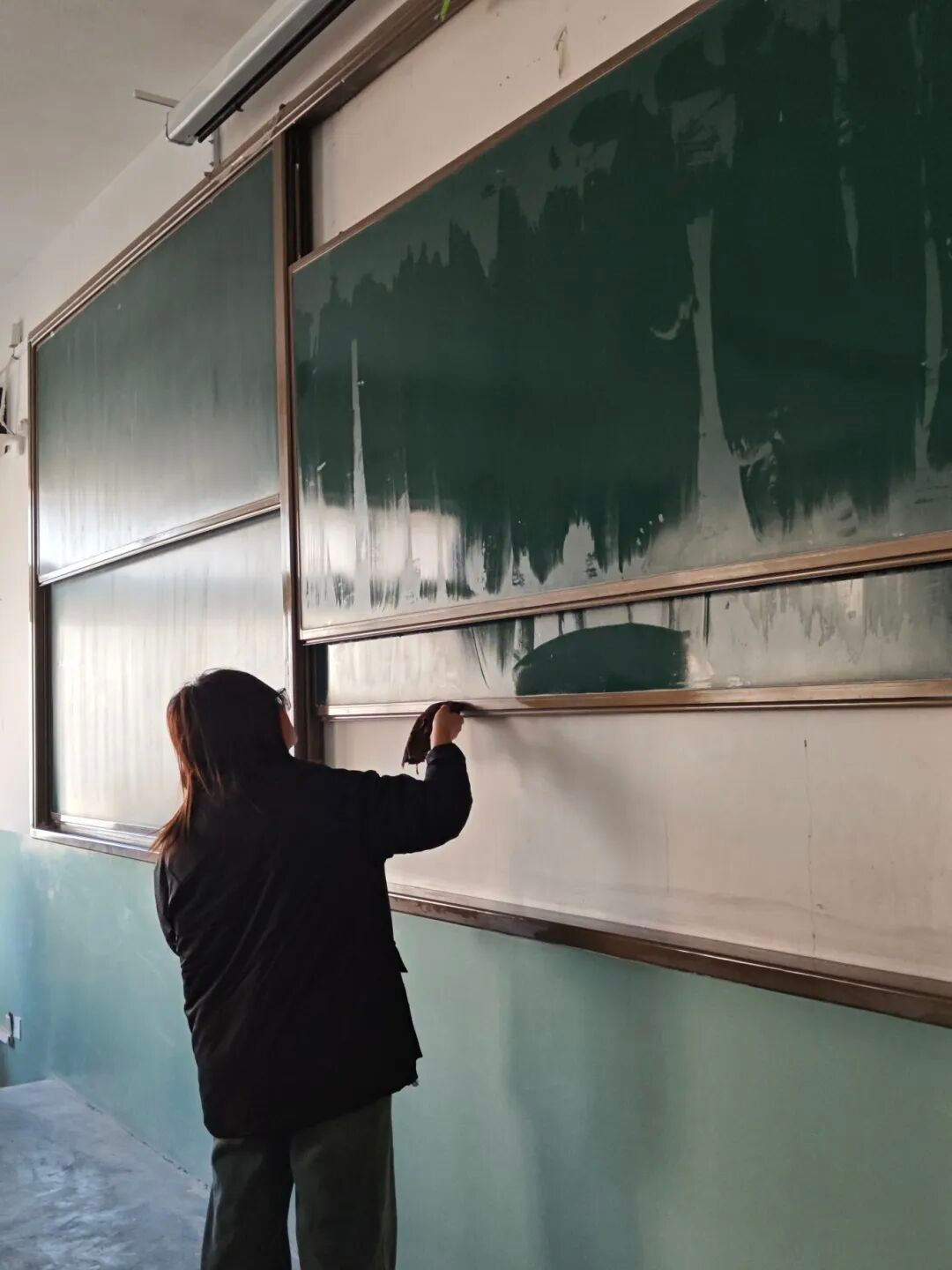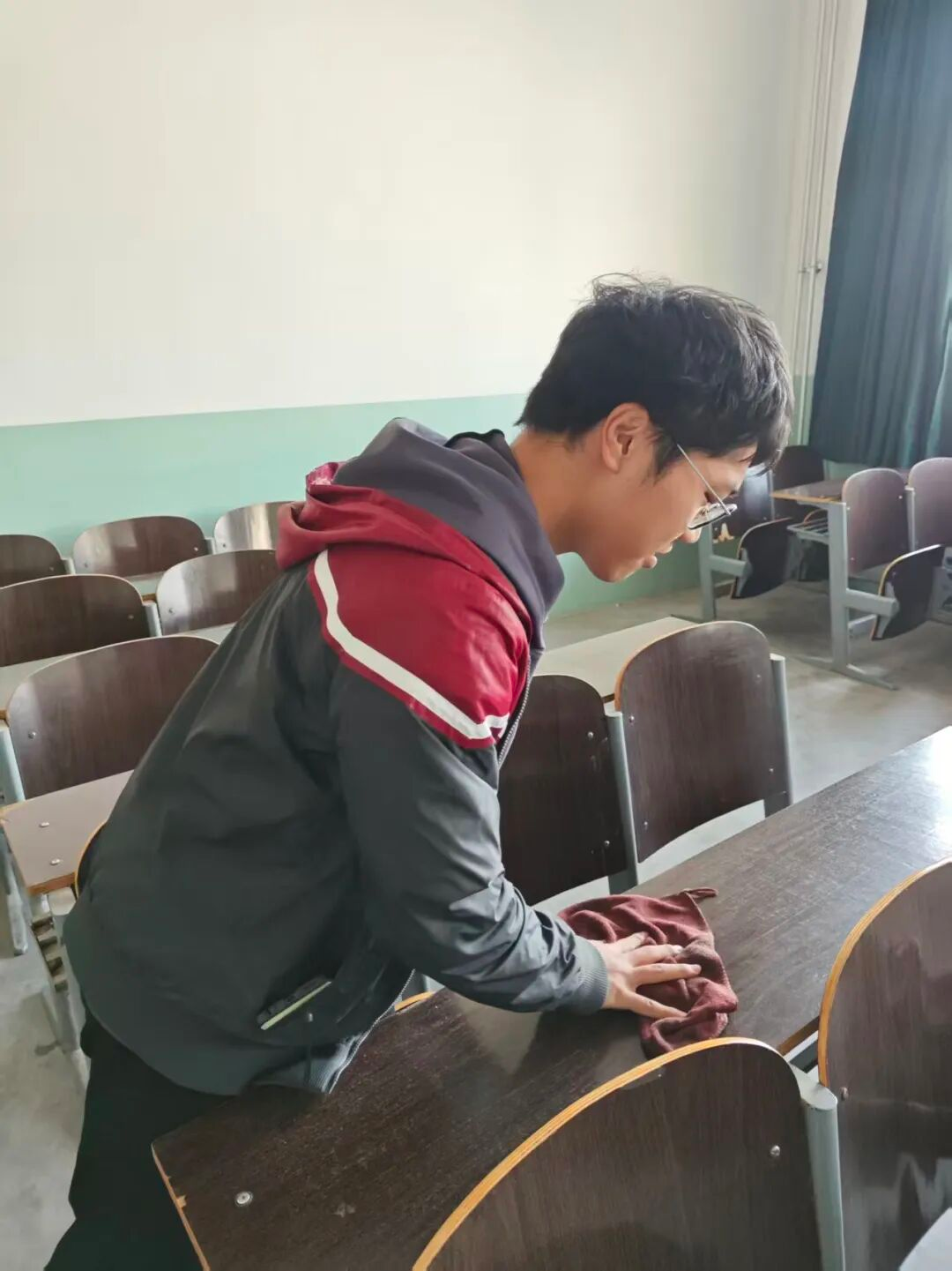 有的同学认真擦拭黑板、讲台和门窗玻璃,确保教学设施光洁如新;有的同学细致清扫地面,拖洗地板,移除顽固污渍;还有的同学耐心整理课桌椅,清理抽屉内的废弃杂物,并将垃圾分类打包,运送至指定存放点。 劳动过程中,同学们发扬了不怕脏、不怕累的团结协作精神,互帮互助,干劲十足。